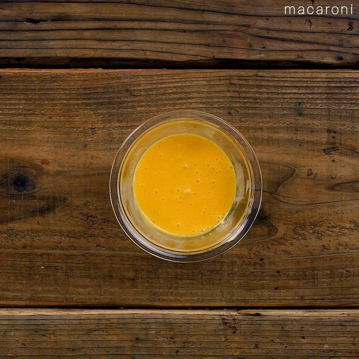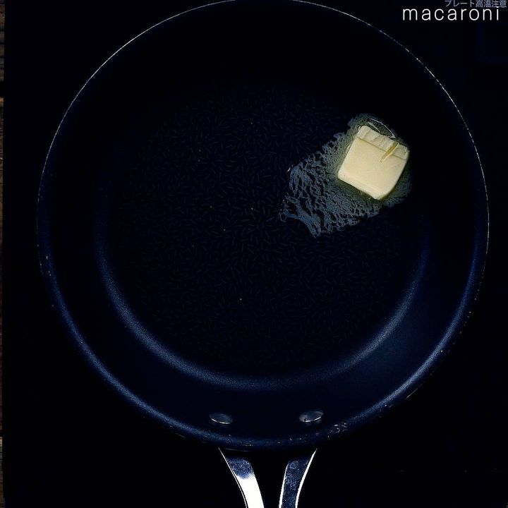 3: フライパンにバターを加えて弱火で熱し、①を加えます。