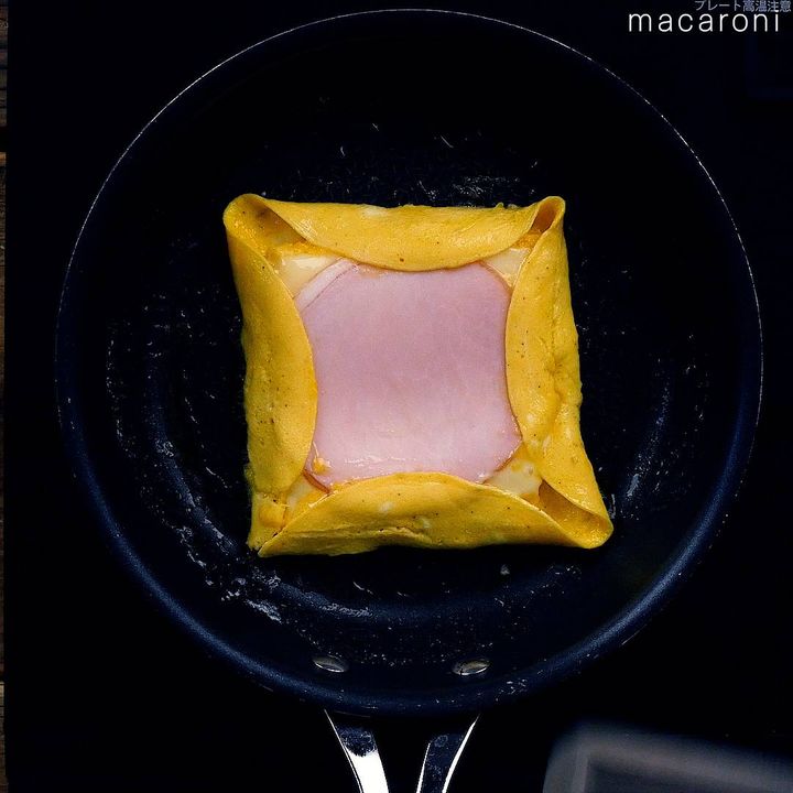 5: とりけるチーズとハムをのせ、卵が軽く固まってきたら四方が食パンの上に重なるように折りたたみます。