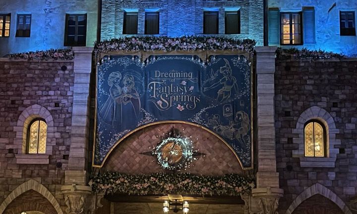 通路にもバナーが登場。花なども飾れられてファンタジースプリングスの雰囲気を演出しています。