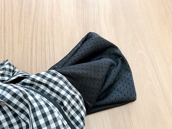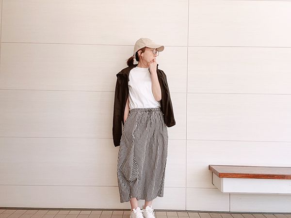 実際に着てみるとこんな感じ。ホワイトとブラックの定番チェック柄が使いやすいし、子どもっぽくなりすぎないので好きです。