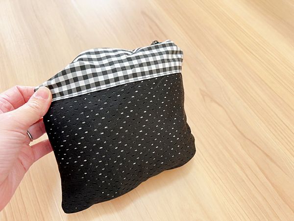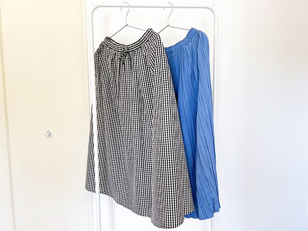 このファスナー付きポケットにスカート本体がまるっと収納できます。収納してしまうと本当にコンパクト。旅行のとき、着替え用に持って行くのにも便利そうです。一度ポケットに収納してから着てみましたが、シワができにくい素材です。