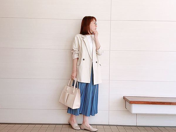 実際に着てみるとこんな感じ。裏地無しですが、しっかりとした素材なので透ける心配はありません。ジャケットと合わせるのもいい感じです。