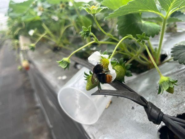 こちらも交配のお仕事中。ミツバチより大きいので、羽音が大きい感じもしますが、とてもおとなしい性格で攻撃したり刺したりすることはほとんどないとのこと。(写真に収めたい私からハチさんが必死で逃げてました。)