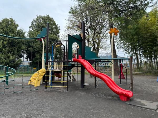 複合遊具は、遊びごたえのあるアスレチック。階段もひと癖あるのが楽しいです。 すべり台は高いものと低いものがあり、未就園児から小学生まで楽しめるように作られています。