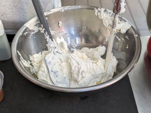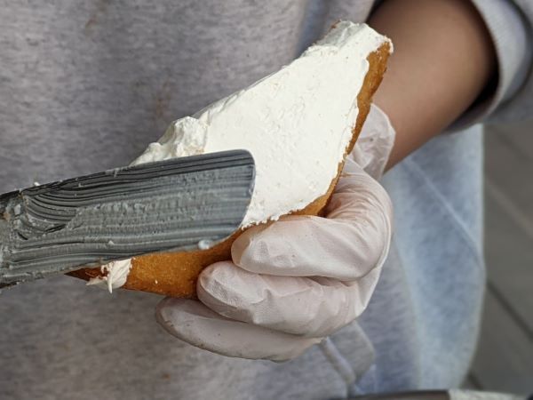 そして「チョコいちご」を作るところも見させていただきました。揚げたてのパンの粗熱が取れたら入れるのがこちらのクリーム!
