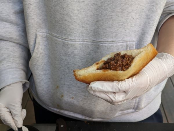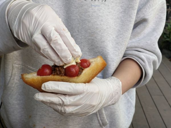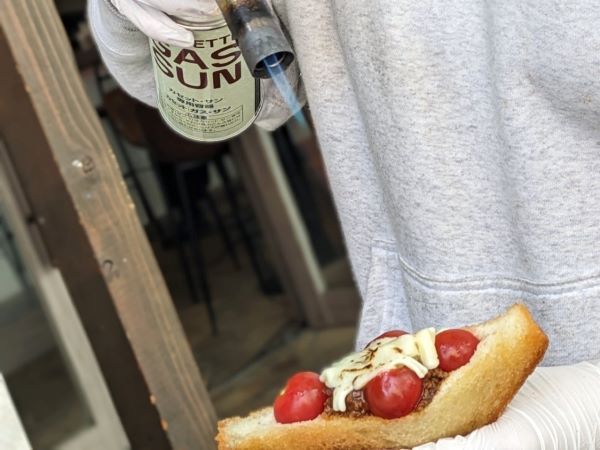 ①~⑪はスイーツ系、⑫~⑯はお惣菜系で、全て食パンを揚げてから具材を挟むスタイルの「揚げサンド」です。スイーツ系には、お店で泡立てた特製の生クリームをサンド。クリームの甘さがしつこくならないように、優しい甘さが特徴の和三盆糖を使っています。⑥の抹茶クリーム、⑧のごまクリーム、⑪のチョコクリームには、ベースの生クリームにそれぞれ味がプラスされていますよ。 お惣菜系は⑯の本場ブラジルシェラスコサンドのみ18:00からの提供です。 どれも気になったのですが、今回は「チーズとろけるタコスサンド」をいただいてみることにしました。まずは専用のフライヤーで食パンを揚げたら、タコミートを盛る!盛る!溢れそうになるまで入れ込みます。