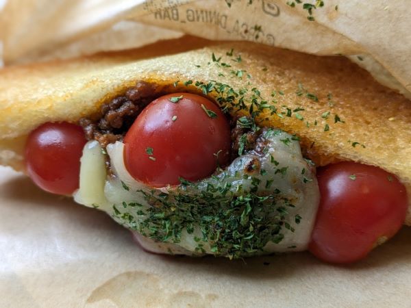 早速熱々をガブリ!カリカリのパンとタコミートが新感覚~♪タコミートはスパイスが程よく効いていて、絶品です!トロ~リチーズと、大粒の甘いミニトマトが3個も入っていて大満足でした。 正直、揚げなくても良いのでは?と思っていたのですが(笑)、カリッと揚げてあるので油っぽくなくペロリと食べることができましたよ。1か月で2500~3000個も売れるというのも納得です。