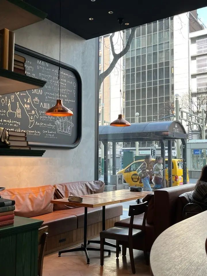 地下からエスカレーターで1階に行き、メイン玄関から外に出ると北向きにカフェがあります。