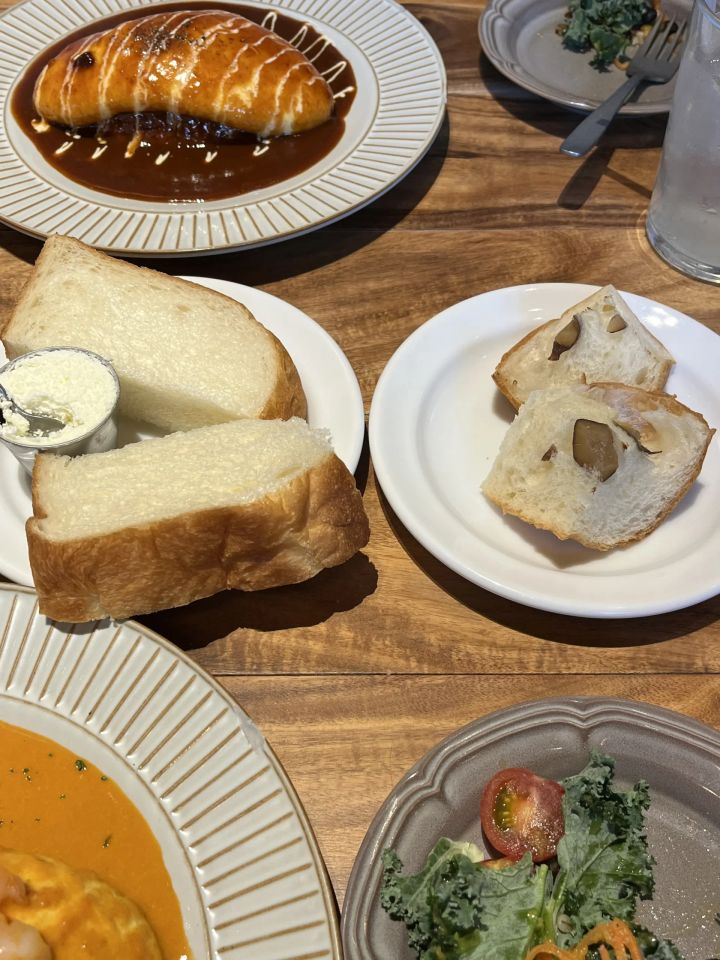 食パンにこだわりがあるようで、店内にパン屋さんのブースが設置されており、持ち帰りの購入も可能です。ワンハンドレッド食パンは日替わりも作っているそうで、この日は「栗」。出来立てパンを、ふわふわのホイップバターと一緒に。