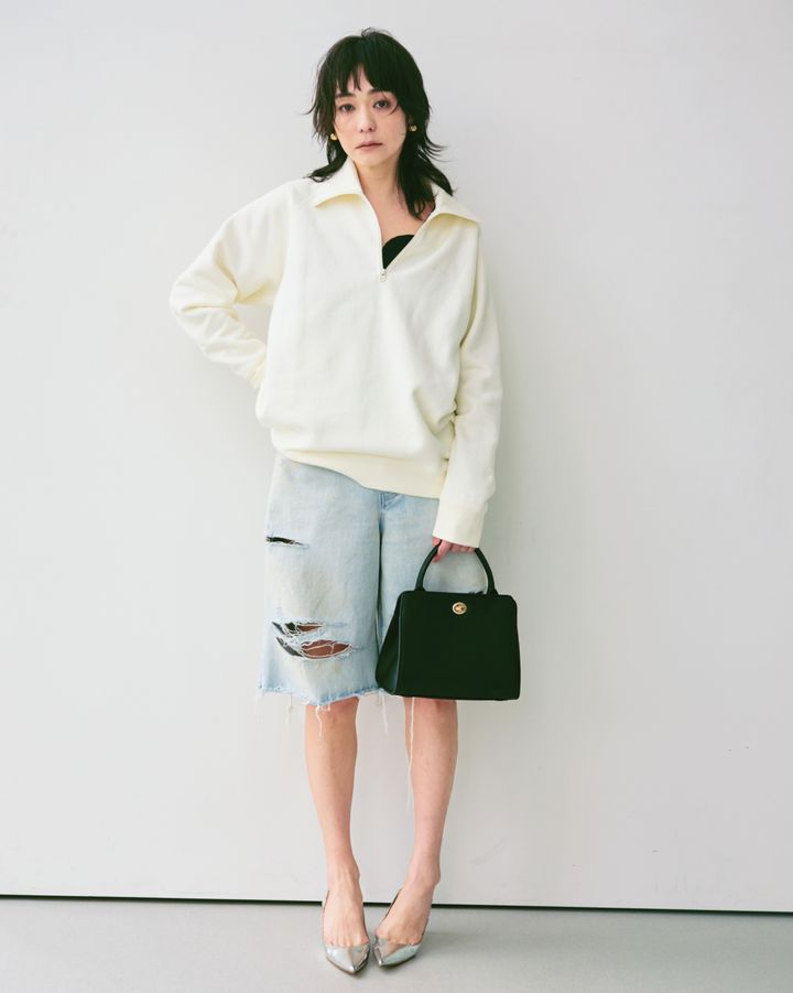 ルーズな首元からインナーをチラリ。スエット※ユニセックス[SIZE:L]¥30,800(エイトンステイプルズ)、デニムパンツ※メンズ[SIZE:M]¥16,500(リー/エドウイン・カスタマーサービス)、中に着たビスチェ¥28,600(フミエタナカ/ドール)、ピアス¥19,800、バッグ¥18,700(共にユナイテッドアローズ/ユナイテッドアローズ 六本木ヒルズ店)、パンプス¥36,300(ピッピシック/ベイジュ)