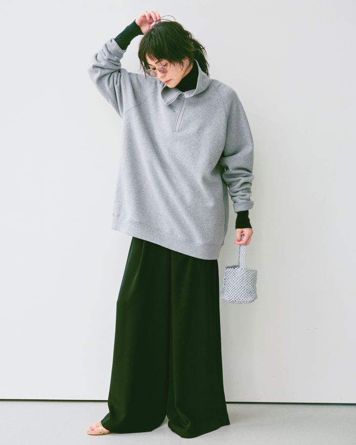 スエット※ユニセックス[SIZE:XL]¥30,800(エイトンステイプルズ)、タートルネックニット¥35,200(ヨー ビオトープ)、パンツ¥31,900(ハイク/ボウルズ)、サングラス¥48,400(アイヴァン/アイヴァン 東京ギャラリー)、バッグ¥8,690(バグマティ/スティーブン アラン シンジュク)、サンダル¥59,400(ネブローニ)
