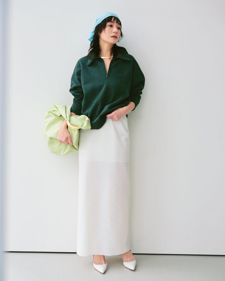 スエット※ユニセックス[SIZE:M]¥30,800(エイトンステイプルズ)、中に着たドレス¥38,500(ヨー ビオトープ)、頭に巻いたストール¥15,950(アソース メレ/フレームワーク ルミネ新宿店)、ネックレス¥22,000(ケネス ジェイ レーン/シティショップ)、バッグ¥14,300(ル ベルニ/ル タロン 有楽町マルイ店)、パンプス¥35,200(ピッピシック/ユナイテッドアローズ 六本木ヒルズ店)