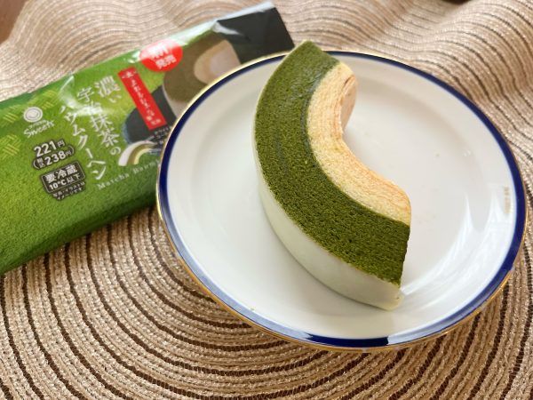 濃い抹茶のバウムと、やさしい甘さのミルクバウムの2層のバウムクーヘンです。コーティングしたホワイトチョコの風味が抹茶ともよく合います。生地はしっとり、まろやかな口当たりのスイーツになっていました。