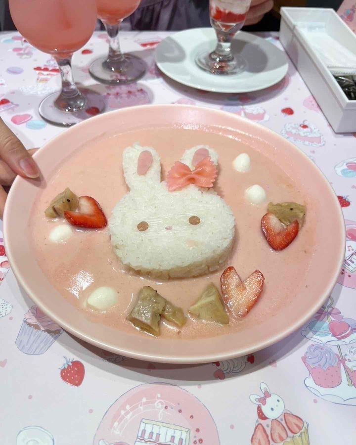 ピンク色をしていて味の想像がつかないうさぎ♡ピンクカレーは、甘くはなくて一般的にスパイシーなカレー!うさちゃんの顔を崩すのがもったいないこと以外は、楽しく美味しくいただけました。