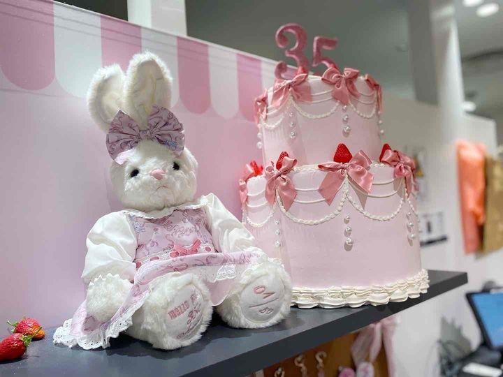 物販のスペースには、限定グッズやオリジナルキャラクター「ベリエちゃん」グッズのガチャガチャなどがありました。フェイクスイーツのケーキや、35周年記念オリジナルプリントの服を着たうさぎさんのぬいぐるみがかわいい♡