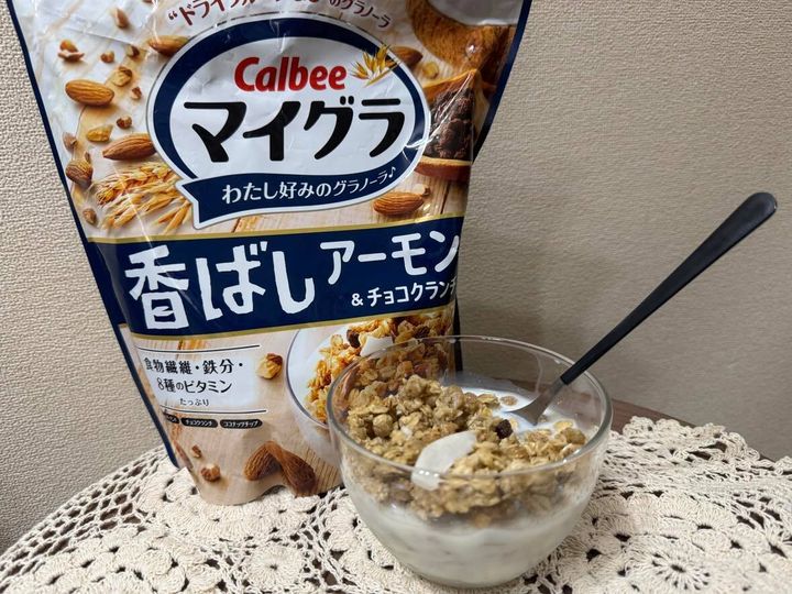 食物繊維や鉄分、ビタミンがたっぷり入っている「香ばしアーモンド&チョコクランチ」は、優しい甘さがあって食べやすいです。