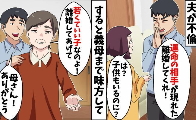そして1カ月後、ようやく彼女が家に帰るのかと思いきや、私は突然「俺と離婚してくれ」と夫に打ち明けられました。「運命の相手が現れた」とのことで、彼女とラブラブな様子。義母も「私の世話をしてくれる彼女こそ、わが家の嫁にふさわしい子なのよ。離婚してあげて」と畳みかけてきます。