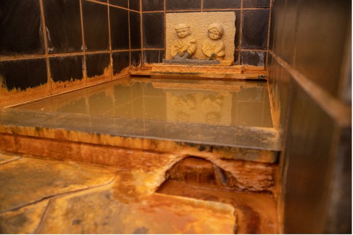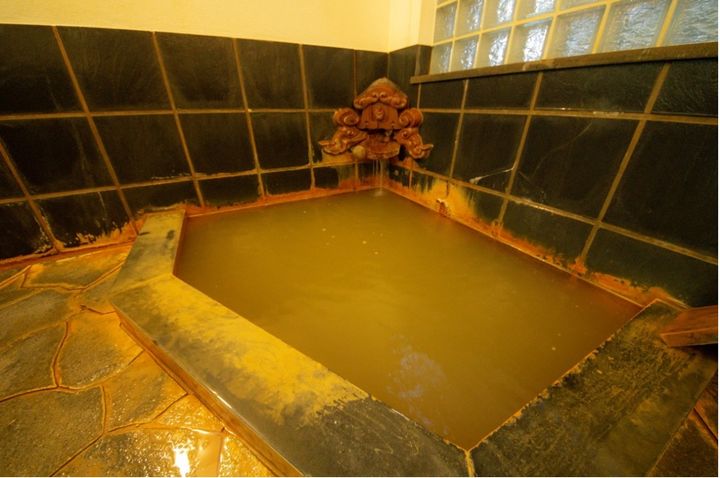 男湯女湯ともに収容人数がそれぞれ3名までの小さめな湯船。近くの薬師湯から引いている源泉は湯の花が浮かぶ褐色の天然湯で、湯船のまわりに付着している温泉成分から効果の高さが窺えます。