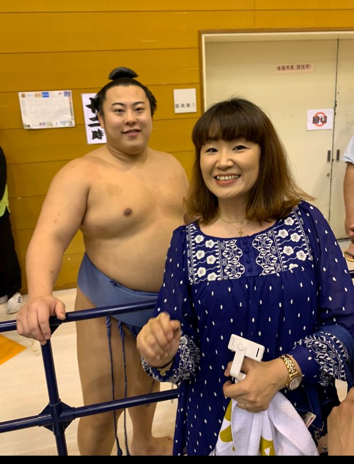 力士に声を掛けたり、一緒に写真を撮ってもらったり、握手をしてもらったり