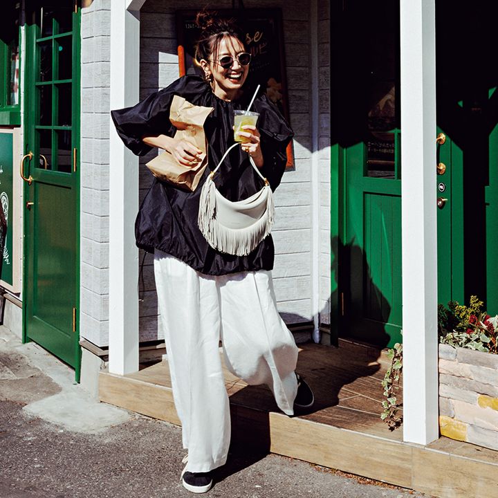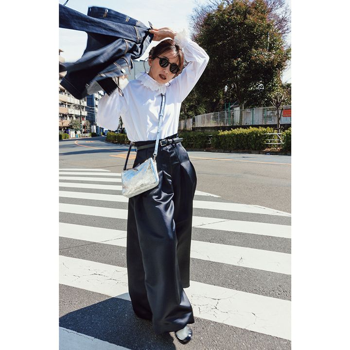 ブラウス¥31,900(ユナイテッドアローズ/ユナイテッドアローズ 六本木ヒルズ店)パンツ¥53,900(エイトン/エイトン青山)サングラス¥39,600(アイヴァン/アイヴァン 東京ギャラリー)ピアス¥22,000(マユ/マユ ショールーム)リング¥77,000(ソフィー ブハイ/エスケーパーズオンライン)バッグ¥143,000(J&M デヴィッドソン)スニーカー¥35,200(グラフペーパー/グラフペーパー 東京)