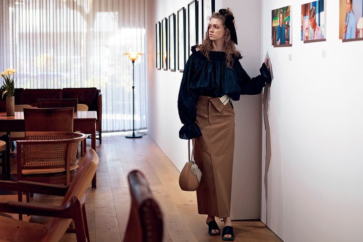 ベージュマキシスカート 20,900円/MAISON SPECIAL(メゾンスペシャル 青山店) 黒ブラウス 50,600円/デパリエ(デパリエ 伊勢丹新宿店) シュシュ 57,200円/ALEXANDRE DE PARIS(アレクサンドル ドゥ パリ GINZA SIX店) ベージュバッグ 36,300円/VASIC(ヴァジックジャパン) 黒パンプス 39,600円/ロランス(ユナイテッドアローズ 六本木ヒルズ店)