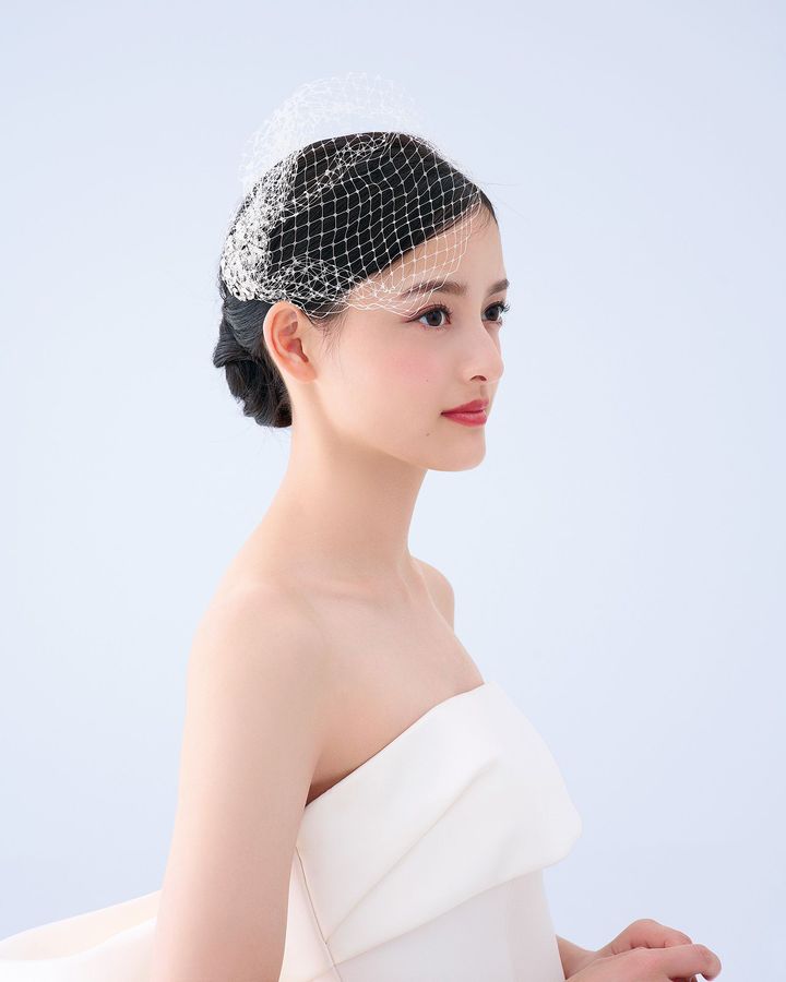 ネットチュールを主役にしたコンパクトなシニヨンスタイル。タイトにまとめると頭のシルエットが目立ちやすいので、横から見ても形がきれいになるように、ボリュームを調整しながらまとめることがポイントです。ロイヤルテイストなど、世界観のあるデザインのドレスと好相性。ドレス レンタル¥462,000(ヴィクター&ロルフ マリアージュ/ジュノ 恵比寿店 tel.03-5778-3031) ネットチュール¥16,500(フランブルーム/メゾン シュシュ tel.052-253-7176)