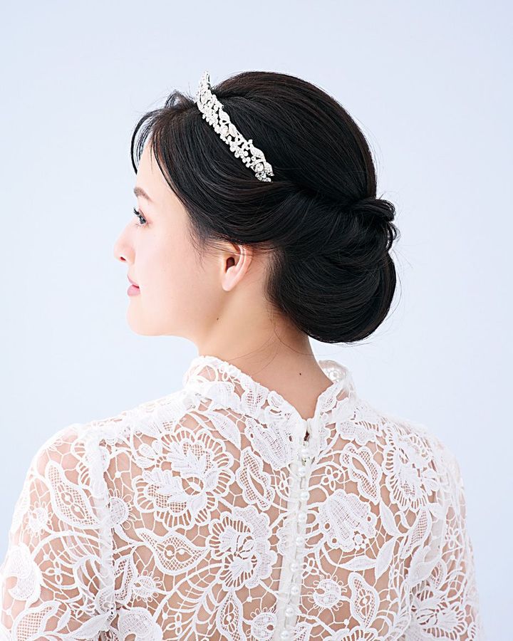 後ろの低い位置で髪をロール状にまとめるギブソンタック。襟足でコンパクトにまとめるタイプのシニヨンよりも、シルエットをサイドに広げてボリュームを出すことができるので、エレガントかつ高級感ある雰囲気を演出しやすいスタイル。王道のティアラにもよく合います。