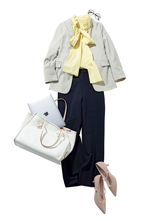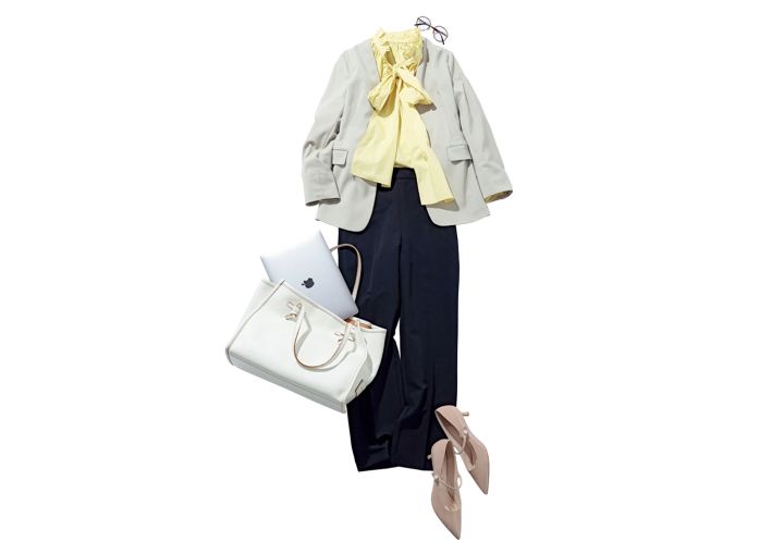 セットアップ(パンツ)¥19,910/ミラ オーウェン ルミネ新宿2店 セットアップ(ジャケット)¥14,990/アンフィーロ(オンワード樫山) ボウタイブラウス¥19,800/カデュネ トートバッグ¥69,300/ジャンニ キアリーニ(ジャンニ キアリーニ 銀座店) ストラップパンプス¥18,700/ダイアナ(ダイアナ 銀座本店) メガネ¥12,000/OWNDAYS