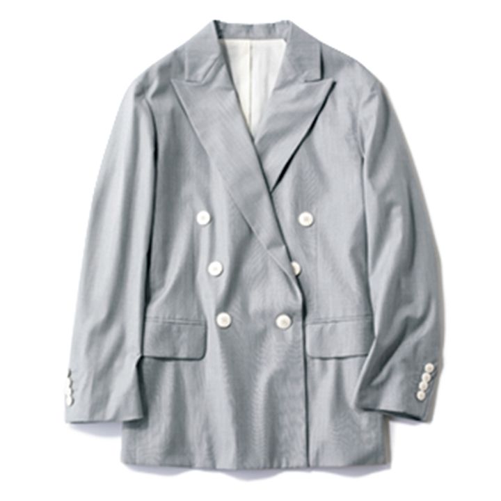 ほんのり広めの肩幅がアップデートポイント。旬なグレーでハンサムに仕上がるダブルジャケット。ジャケット¥50,600(バッカ/ビーエディション ニュウマン新宿店)