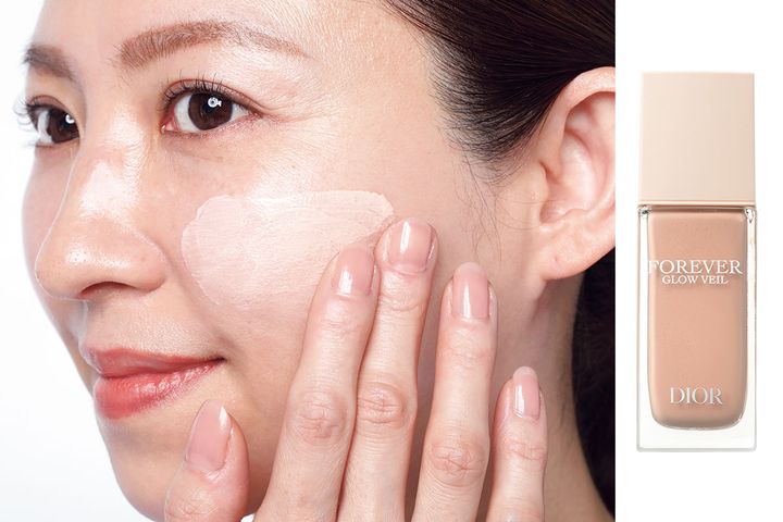 24時間崩れないツヤ肌を仕立て、潤いと輝きに満ちた仕上がりを叶える下地。乳液のようななめらかテクスチャーで馴染み抜群。ディオールスキンフォーエバーグロウヴェール SPF20・PA++ ¥7,150(パルファン・クリスチャン・ディオール)