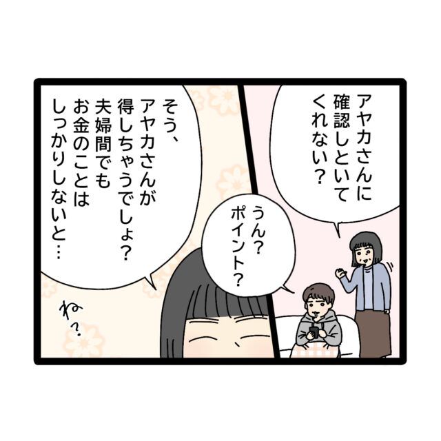 「そう、アヤカさんが得しちゃうでしょ?夫婦間でもお金のことはしっかりしないと・・ね?」