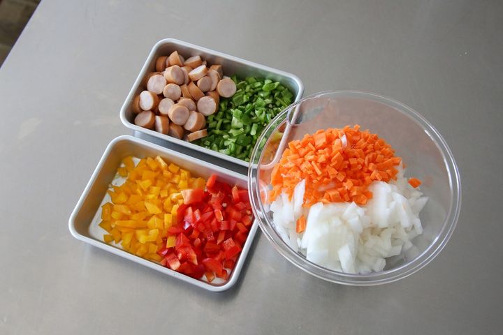 2. ピーマン、パプリカもみじん切りにし、ウインナーは5mmの輪切りにする。