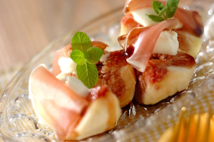 生ハムの塩気とイチジクの甘みが絶妙なバランスで美味。バルサミコ酢をかけて召し上がれ。生ハムはフルーツと相性が良いので、初夏には桃、秋には梨など旬のフルーツと組み合わせると、その時期ならではの美味しいコラボを楽しめますよ。