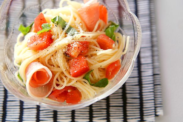 しっかりと冷やしたトマトの冷製パスタに生ハムと粉チーズの塩気がからんで、さっぱりなのにコク旨な仕上がり。バジルの風味もいいアクセントになり、暑い日にイチオシです。お酒ともよく合います。