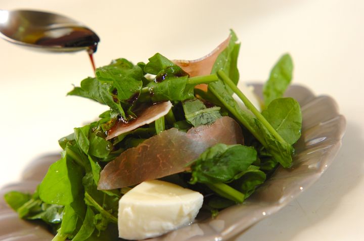 生ハムの塩気に、みずみずしいカブとマッチして美味しさ倍増です。カブは塩もみして水分を抜いてから、粒マスタード入りのドレッシングで漬けるのがポイント。さっぱりと食べられ、おつまみとしても◎。