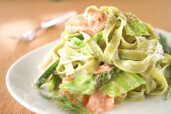 フライパンで作れる濃厚クリームソースに生ハムの塩気が見事にマッチ! 太めのフィットチーネとも好相性です。ニンニクの香りが食欲をそそります。キャベツやアスパラのシャキシャキ食感や香りがパスタ全体を格上げしてくれますよ。