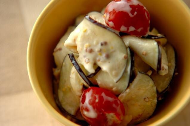 プレーンヨーグルト、粒マスタード、マヨネーズのドレッシングでナスを和えました。「水ナス」で作る時は、アク抜きの必要がないので切って和えて完成です。さっと作れるヘルシーなサラダです。