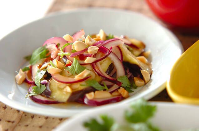 レシピでは長ナスを使うためレンジでチンする工程を含みますが「水ナス」はそのままレンチンせず使えます。「水ナス」の甘みがエスニックソースとよく合います。ナッツを入れて食感のアクセントをプラスしましょう。