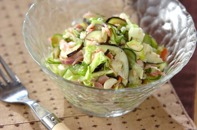 キャベツ、キュウリ、ミョウガに大葉など、野菜それぞれの甘みが味わえるサラダです。ナスも生で食べましょう。炒めたベーコンの塩気が絡まり美味。最後に味を見て塩コショウで調整してください。