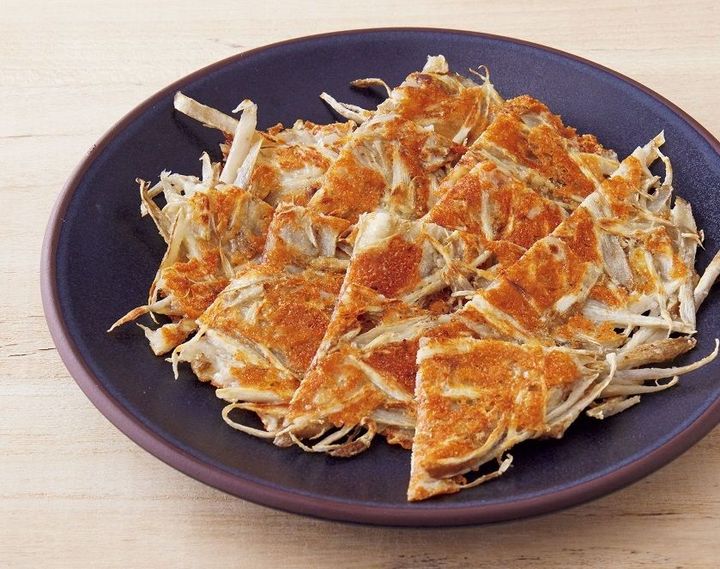直径20cmのフライパンに(1)を入れて広げ、3分ほど焼き、上下を返してさらに3分ほど、こんがりするまで焼く。塩少々をふり、食べやすく切って器に盛る。