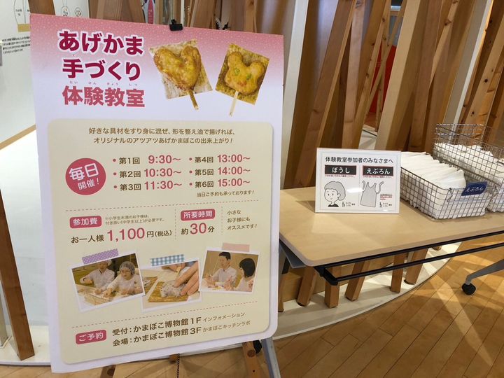 3階にある「かまぼこキッチンラボ」では、あげかま手作り体験教室が毎日開催されています。こちらは小さな子どもも挑戦しやすい体験です(1人1100円・約30分)。