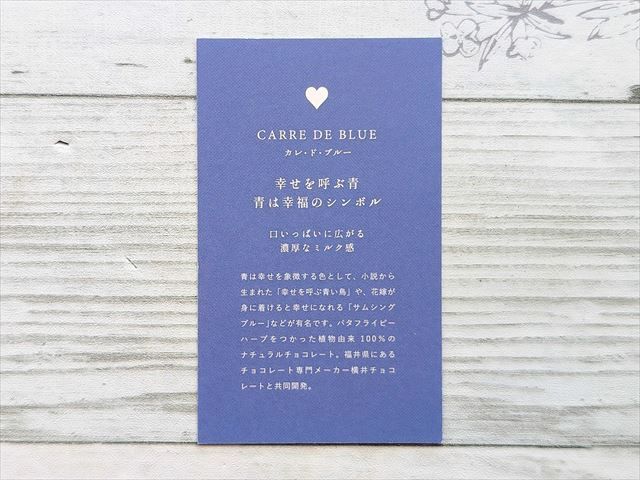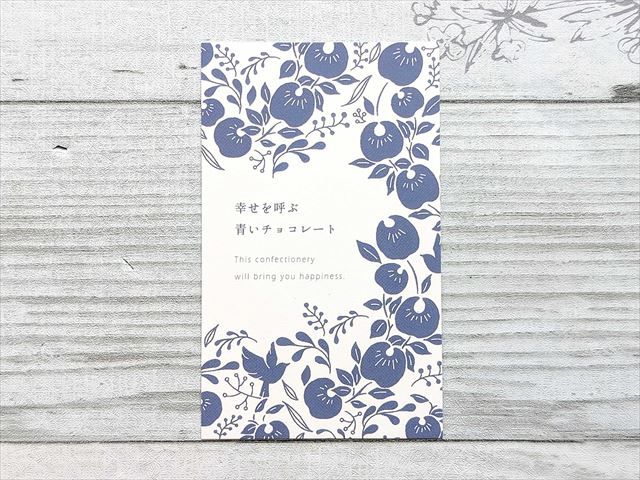 おや? 何やら一緒にカードが……「幸せを呼ぶ青 青は幸福のシンボル」。青色は童話の「幸せを呼ぶ青い鳥」や、花嫁が身に付けることで幸せになれるというおまじないの「サムシングブルー」といった幸福の象徴とのことです。なるほど、「幸せを呼ぶ」にはぴったりの色かもしれませんね。
