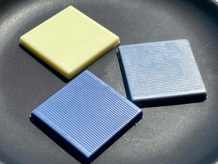 箱を開けるとブルー・ホワイト・ライトブルーと3色のチョコレートが入っています。枚数はブルーとライトブルーがそれぞれ4枚、ホワイトが1枚の合計9枚です。