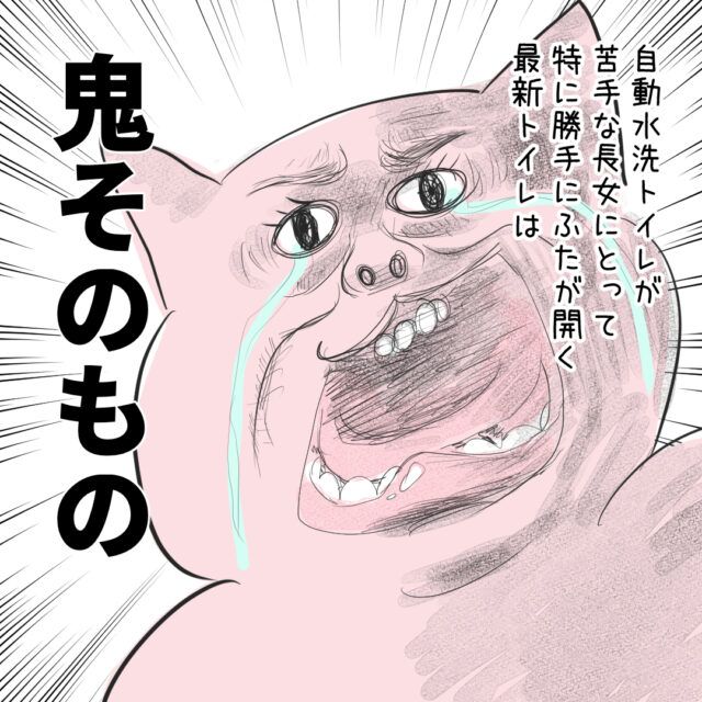 自動水洗トイレが苦手なこねたんにとって特に勝手にふたが開く最新トイレは鬼そのもの。