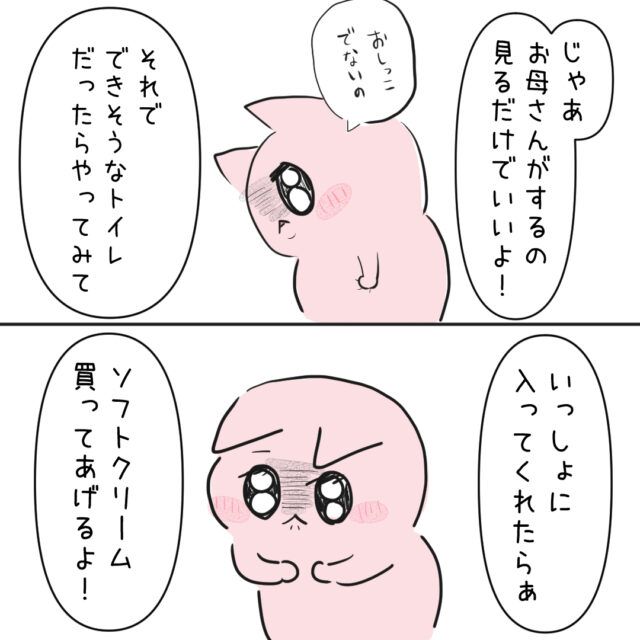 それを見たマーミーさんは、トイレでするなら今しかない!と思い、出ているタイミングでそのままトイレに座らせました。