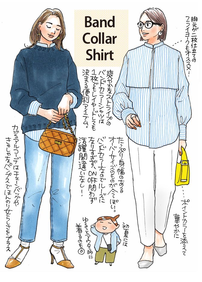たっぷり身幅のあるオーバーサイズのものが今っぽい。バンドカラーなのでルーズになりすぎず、ON・OFF問わず活躍間違いなし!