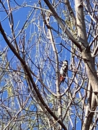 スマホの撮影なので分かりづらいかと思いますが、アカゲラです! 連続して木をつついて音を出す「ドラミング」の小気味よい音が、辺りに響いていました。