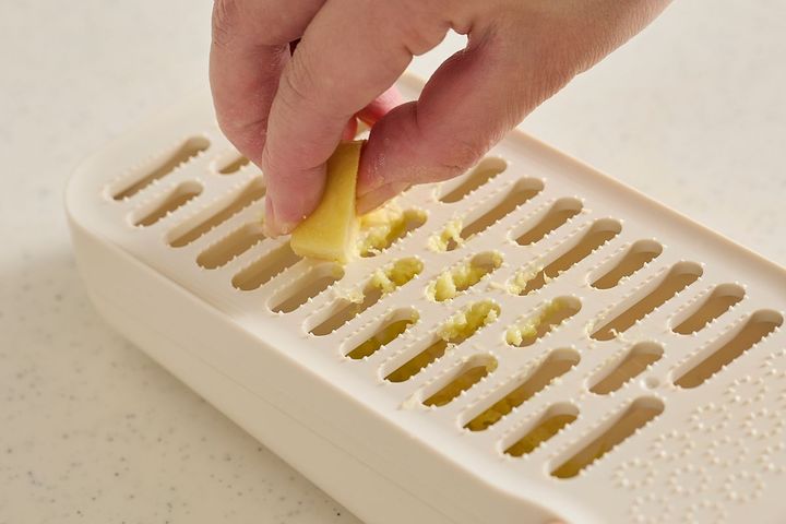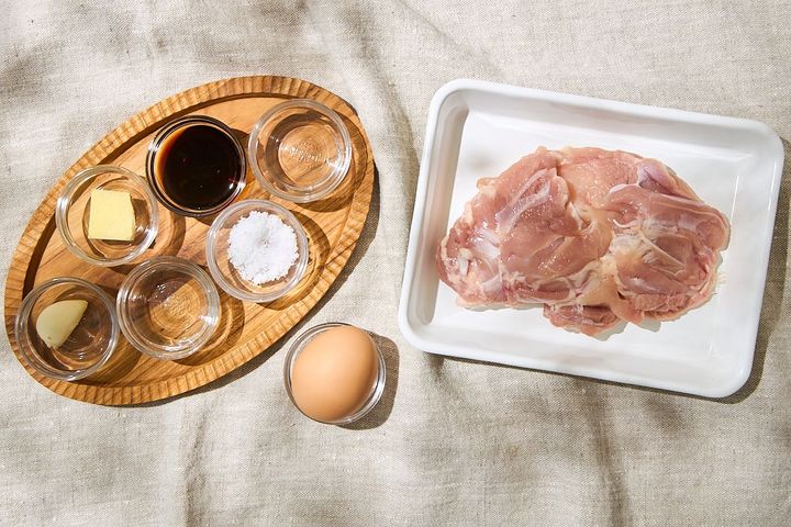 3.ボウルにA、(1)のにんにく、しょうがを入れて混ぜ、鶏肉を加えて冷蔵庫で30分置く。