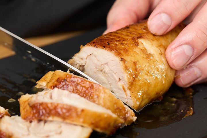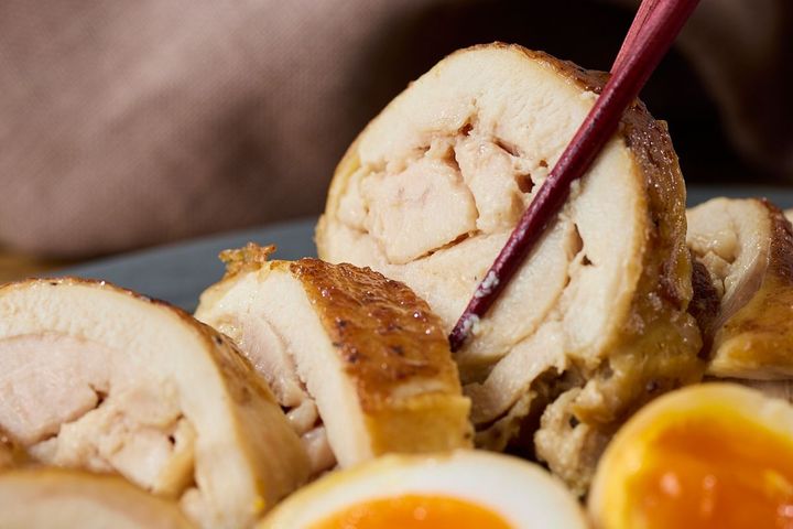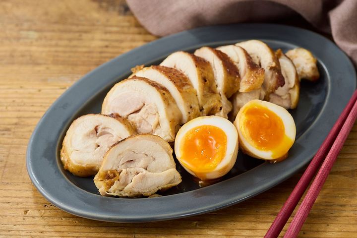 鶏肉をくるくる巻いて作る鶏チャーシュー、巻く前にタレに漬け込んでから火を入れることで、中まで味がしみしみのしっとりチャーシューができあがります。