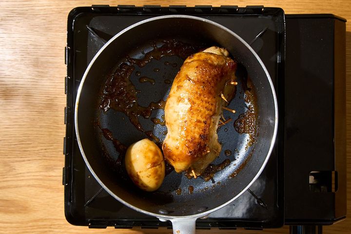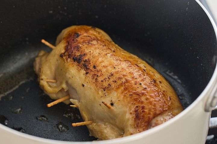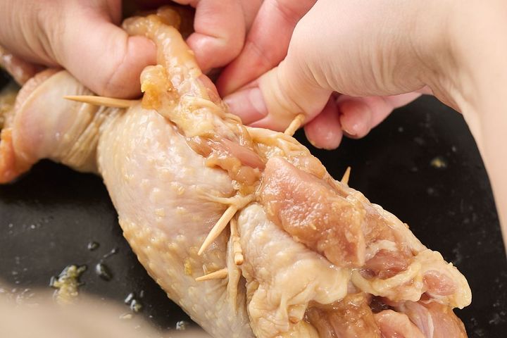 4.鶏肉を取り出して軽く汁気を切る。(残ったたれはとっておく) 鶏肉を皮目を下にして横長に置き、手前からきつく巻く。巻き終わりの部分に爪楊枝を6~7本刺して止める。
